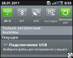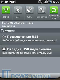 В самом верху окна расположена техническая строчка, на теле которой вынесены ярлыки, отображающие уровень заряда аккумулятора, дату и время (если они активированы в настройках), уровень сотовой сети и прочее. Здесь же реализована возможность работы со встроенным МР3-плеером в режиме воспроизведения музыки. Также можно получить данные о том, какие сообщения или письма были получены, какие программы загружены, какие файлы переданы или получены при помощи Bluetooth. Согласитесь – удобно.