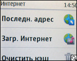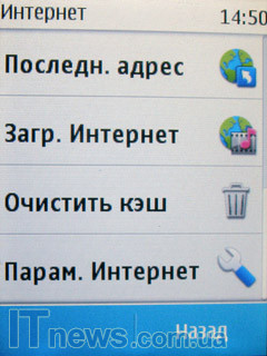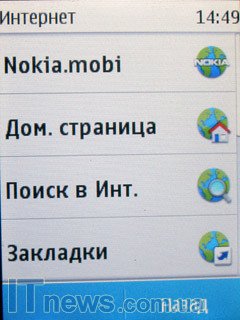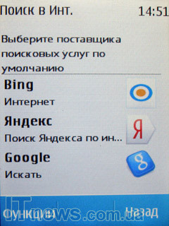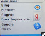 Браузер Интернет. Перед нами не просто "штатное" приложение обозревателя. Сюда производитель интегрировал немалое количество всевозможных коммуникационных сервисов, поисковых строчек и пр. К примеру, если пользователь перейдет в подпункт "Поиск в Интернет", он тут же автоматически попадает на страницу, на который, как я уже упоминал, интегрировано три строчки поисковых систем: Bing, "Яндекс", а также "Google". А стоит, например, посетить подменю "Закладки", как из него уже пользователь получает доступ к различным ярлыкам менеджеров и приложений социальных сетей и других клиентов интерактивного обмена сообщениями. Кроме них, здесь также расположены ярлыки видеосервиса YouTube и сервиса OVI.