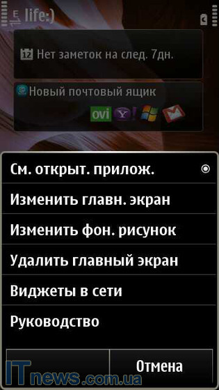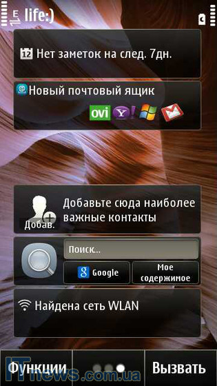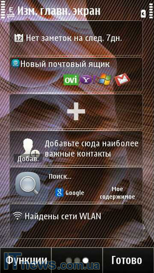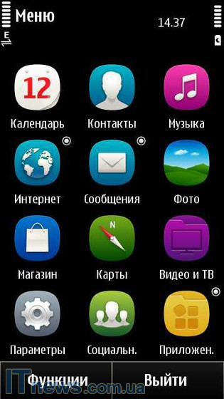 Что же относительно оболочки меню, дела обстоят следующим образом. Даже невооруженным, как говорится, взглядом, видно, что структура оболочки "списана" с оболочки ОС Symbian^3. Изменения синтетические – обновленные пиктограммы, несколько видоизмененная структура, но и только. Как и ранее, пользователь может работать с тремя столами, на которые выносятся всевозможные виджеты и ярлыки. Управление столами простое – достаточно уже нажать кнопку, подписанную как "Функции", ну, а дальше все интуитивно понятно и просто.