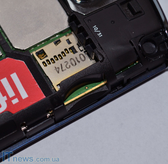 Вся тыльная панель плюс частично боковые грани прикрываются крышкой аккумуляторного блока. В ней реализовано несколько прорезей. Одна из них - под глазок встроенной камеры, а другая - под сетку динамика громкой связи.