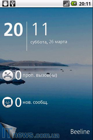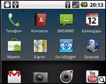 Итак, всего рабочих столов, как я уже говорил, пять. Помимо этого имеется также панель, которая получила название "Главный рабочий стол". В отличие от пяти предыдущих, на эту панель пользователь не может выносить виджеты/ярлыки. Здесь на программном уровне производитель реализовал счетчики SMS/MMS сообщений, пропущенных звонков и прочее. Здесь же находится большой циферблат и другие функциональные ярлыки.