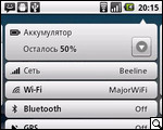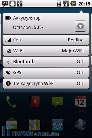В самом верху рабочего стола реализована небольшая панель. Перед нами так называемая панель уведомлений. Устроена она замечательно – совершенно никаких нареканий нет. Для того чтобы попасть на эту панель, пользователю достаточно лишь провести пальцем сверху вниз. Список служебных команд не заставит себя ждать и секунды.