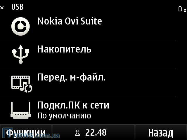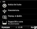 Синхронизация посредством data-кабеля c USB-портом компьютера или ноутбука в Nokia E6-00 возможна следующими режимами: "Ovi Suite", "накопитель", "передача медиафайлов" либо же "модем".