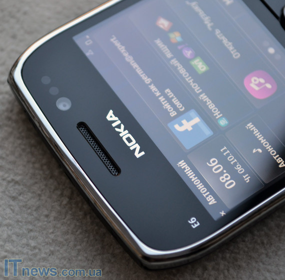 Лицевая панель в Nokia E6-00 фактически поровну делится между клавиатурой, а также дисплеем.