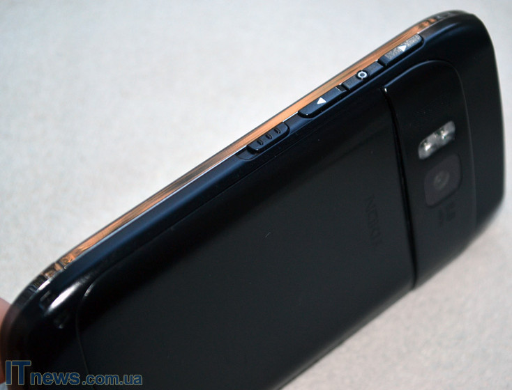 Пожалуй, я нисколько не преувеличу, если скажу, что дизайн Nokia E6-00 если не самый, то один из самых замечательных среди всех смартфонов линейки Eseries. Лицевая панель устройства представляет собой грамотное сочетание глянцевого стекла, прикрывающего собой поверхность дисплея, не менее приятного (по крайней мере, субъективно), глянцевого пластика, а также матового материала, из которого производителем реализована QWERTY-клавиатура. Обратило на себя внимание и то, как сверху и снизу клавиатура словно обрамлена двумя вставками из глянцевого пластика - выглядит потрясающе.