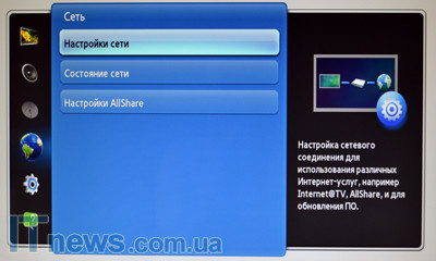 Подменю "Сеть" предоставляет пользователю возможность подключения SyncMaster TA950 к Интернету. К слову, для этого на задней части подставки реализован соответствующий порт. Осуществление подключения к Интернету возможно без предварительного подключения к системному блоку. Мало того, реализованы все условия для того, чтобы пользователь мог даже пообщаться в Facebook – правда, придется подключить клавиатуру. К локальной сети подключение, разумеется, также возможно.