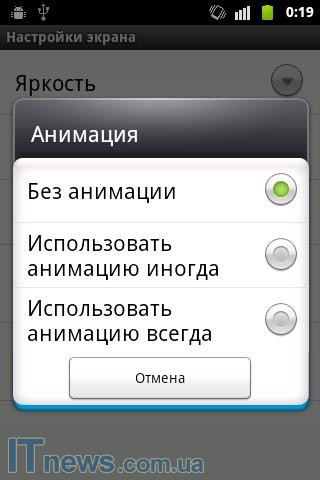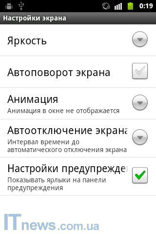 По части настроек, из соответствующего подпункта меню пользователю открывается подраздел, "отвечающий" за регулирование яркости дисплея, подпункт включения/выключения акселерометра, а также подпункт работы с анимацией и др.