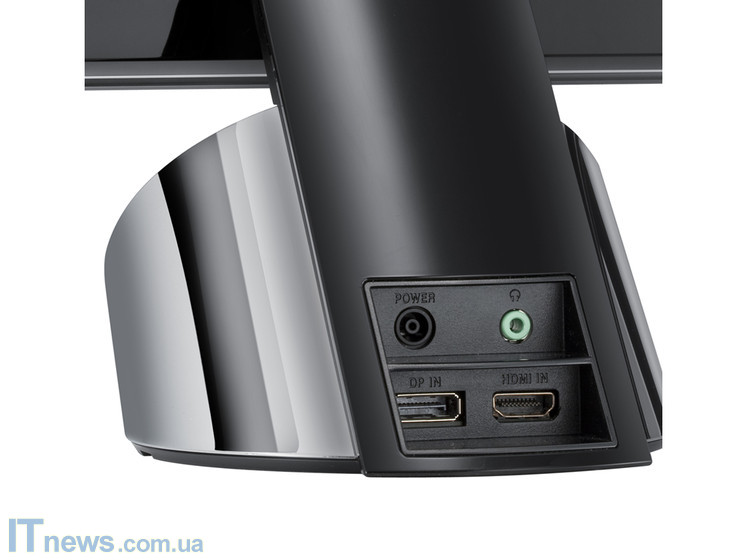 На подставке находятся и интерфейсные разъемы, в данном случае это DisplayPort и HDMI. Решение отказаться от VGA видится нам разумным - этого устаревшего интерфейса не найдешь ни на одной приличной игровой видеокарте, способной «тянуть» 3D игровой режим в максимальном разрешении монитора. Подставка, как и у конкурента, позволяет изменять только наклон экрана.