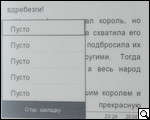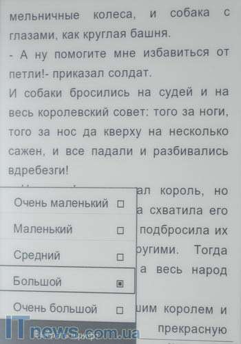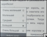 Во время чтения пользователь может выбирать необходимый размер шрифта, посредством нажатия на кнопку, обозначенную небольшой ручной лупой с миниатюрным плюсиком в центре. Небольшое техническое подменю предоставит несколько программируемых масштабов: "очень маленький", "маленький", "средний", "большой" и пр.