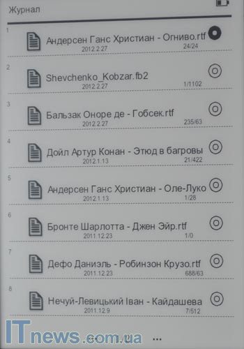 Все открытые пользователем книги автоматически "помещаются" в подменю "Журнал", откуда первый имеет возможность получить быстрый доступ как непосредственно к книге, так и странице, на которой было закончено чтение.