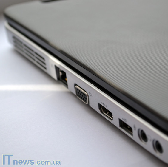 На противоположном торце пользователь найдет достаточно больших размеров вентиляционную сетку, а также порт подключения сетевого кабеля, порт VGA, плюс порты HDMI и USB, а также разъем для подключения наушников и микрофона.