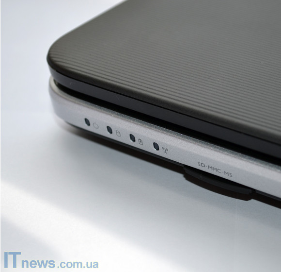 На передней боковой панели имеется несколько индикаторов отображения работы системы, а также слот для карт памяти SD/MMC/MS. О предназначении индикаторов говорить не буду – их функциональность легко изучить, посмотрев на рядом расположенные эмблемы.
