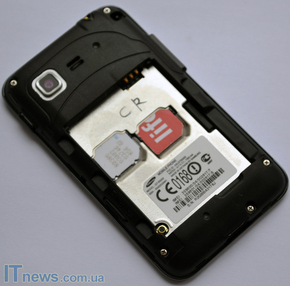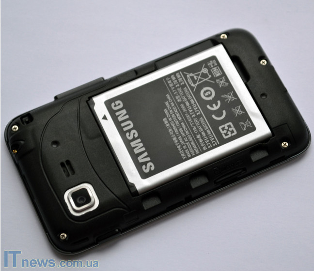 Тыльная панель полностью прикрывается крышкой аккумуляторного блока, в которой имеется вывод глазка встроенной камеры и сетка динамика громкой связи.