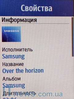 Имеющийся в системе проигрыватель аудио поддерживает работу с форматами AAC+, MP3, WAV, WMA. Композиции в памяти приложения делятся по следующим направлениям: "все дорожки", "списки воспроизведения", "жанры", "исполнители" и пр.