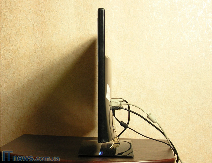 Теперь немного о внешнем виде, а затем снова вернемся к техническим характеристикам. Монитор имеет стильный черный корпус и стоит на розоватой прозрачной ножке, как бы паря в воздухе. Он прекрасно вписывается в интерьер небольшой комнаты, кроме того, его можно повесить и на стену, например, на кухне.