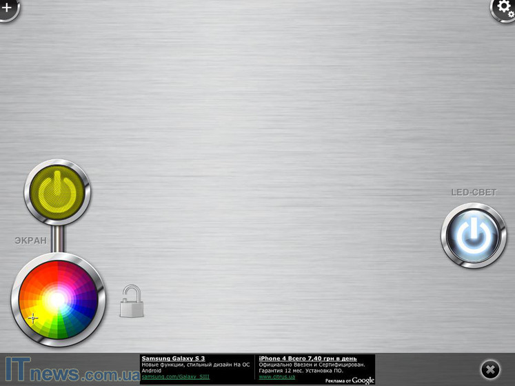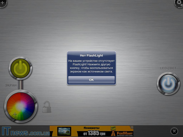 Справа на панели имеется клавиша LED-СВЕТ! Увы, но воспользоваться ее функциональностью не получится. Все дело в следующем. Кнопка слева активирует в качестве фонарика дисплей планшета. А вот LED-СВЕТ во время нажатия использует в качестве фонарика вспышку, которой на iPad 2 нет. Исходя из чего система выдает соответствующее сообщение.