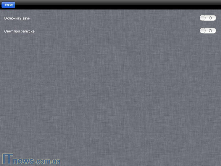 Что же по части настроек, их в данном приложении немного. Например, нажав на небольшую кнопку вверху справа, которая обозначена двумя зубчатыми колесиками, пользователь переходит в небольшое подменю, где может активировать звуковые сигналы работы приложения, а также активировать свет при запуске. Чтобы заработало и первое, и второе, достаточно уже передвинуть соответствующие ярлыки.
