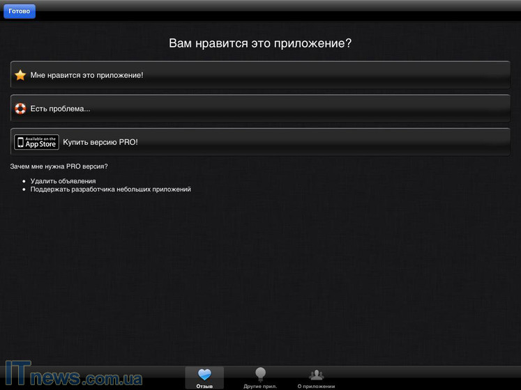 Объем дистрибутива в App Store немногим больше трех мегабайт. Для того чтобы загрузить это приложение в память планшета, понадобится в худшем случае секунд 20-30, не более того. Никаких скрытых либо же встроенных покупок нет, за исключением одной – система предлагает купить версию PRO. Откровенно говоря, во время осмотра ее в App Store особых отличий я не увидел, так что приобретать или нет pro-версию, как говорят, личное дело каждого.