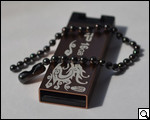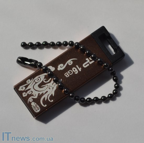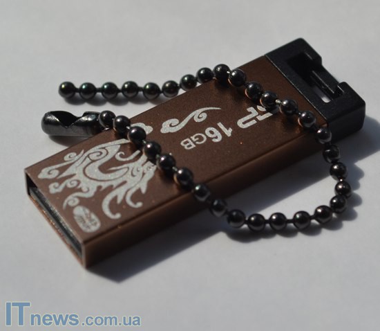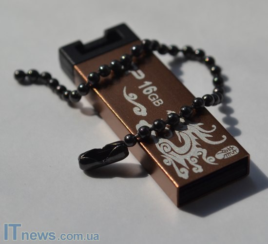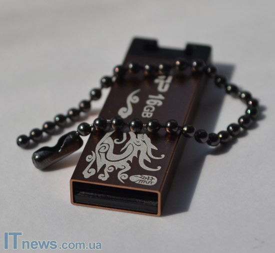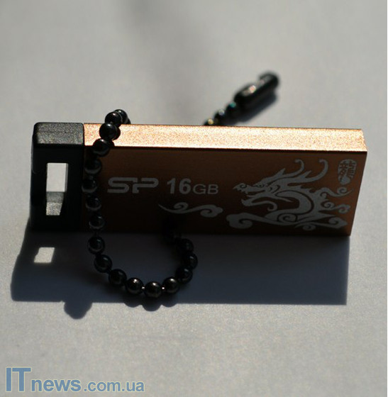 Помимо этого, на одной из стенок корпуса при помощи специальных красок белого цвета нанесено изображение дракона, а также лого компании-производителя плюс объем накопителя. В двух последних как такового ничего необычного нет, а вот белый дракон на золотистом фоне выглядит впечатляюще – кажется, что задание перед дизайнерами Silicon Power Touch 836 было поставлено создать более аксессуар под имидж каждому, а не компактный, металлический USB-накопитель. Что ж, надо сказать, удалось и очень достойно.