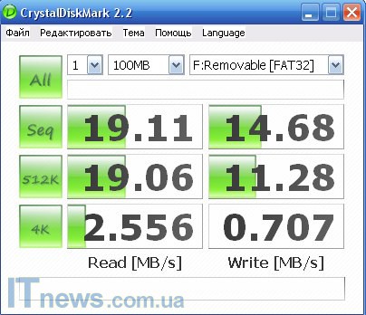 Тестирование скорости записи и считывания данных проводилось с помощью утилиты CrystalDiskMark 2.2. Результаты ниже.
