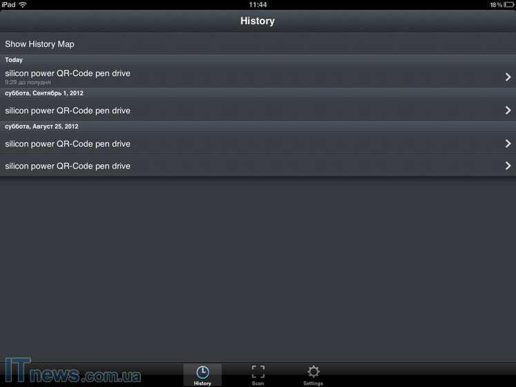 Меню приложения состоит из трех больших подразделов: History, Scan и Setting.