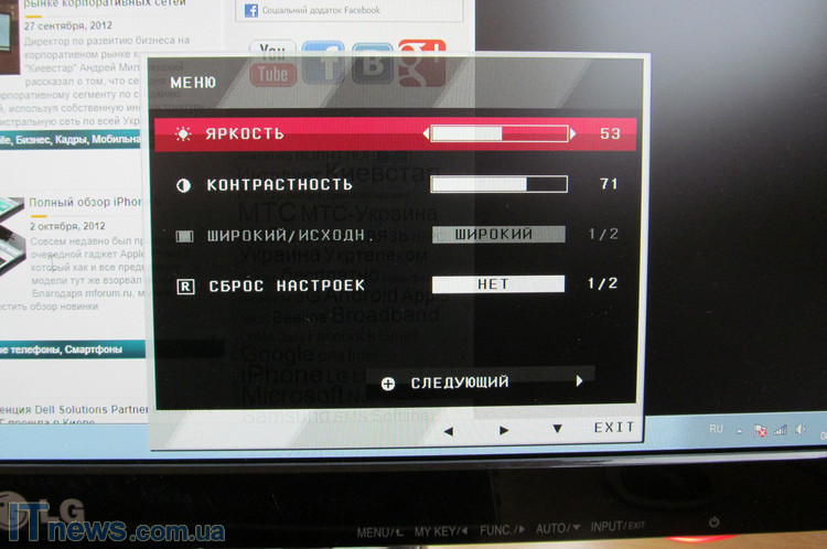 Зайдя в меню при помощи соответствующей кнопки, можно изменить яркость, контрастность, четкость картинки, язык интерфейса. Клавиша My Key используется для переключения между одним из пяти режимов, а кнопка FUNC обеспечивает доступ к основным функциям устройства, включая энергосберегающий режим или опцию "Двойной дисплей", для работы которой нужна установка Dual Package (с диска в комплекте поставки).