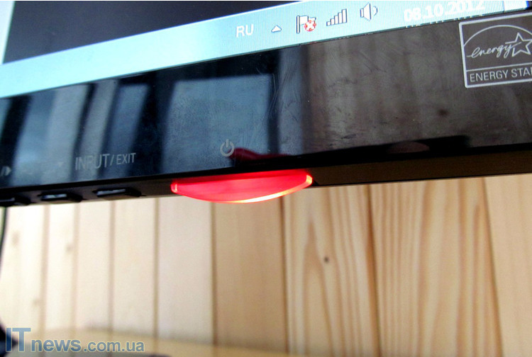 Управление монитором осуществляется при помощи пяти физических (не сенсорных) кнопок, размещенных в правой части дисплея снизу на ободке. Кнопки все сверху подписаны. Кнопка включения-выключения имеет оригинальный дизайн и подсвечивается красноватым цветом.