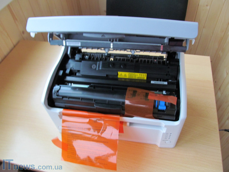 Принтер удобно и компактно размещается на столе. Надо открыть крышку, распечатать картридж, удалить все защитные наклейки, повернуть рычажок тонера и вставить конструкцию в принтер. Собственно, все графически показано в краткой инструкции.
