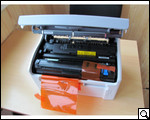Еще надо пристегнуть лоток к задней части принтера и загрузить в него бумагу. В лоток влезает до 150 листов А4. Сверху же выезжает до 30 листов. Хотя, принтер так быстро печатает, что иногда отпечатанные листы просто слетают с лотка. Также загружать по одному листу (ручная подача) можно в щель на передней панели. С ручной подачи лучше печатать на нестандартных носителях: на плотной бумаге, пленках или конвертах.