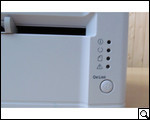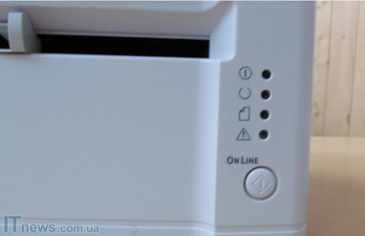 Слева на передней поверхности принтера имеется кнопка включения-выключения, а справа световые индикаторы работы устройства и внизу — кнопка On Line. Это кнопка рабочего режима, которая переключает принтер в рабочий или автономный режим. Также для удаления текущего задания в принтере необходимо ее нажать и удерживать в течение 5 с.