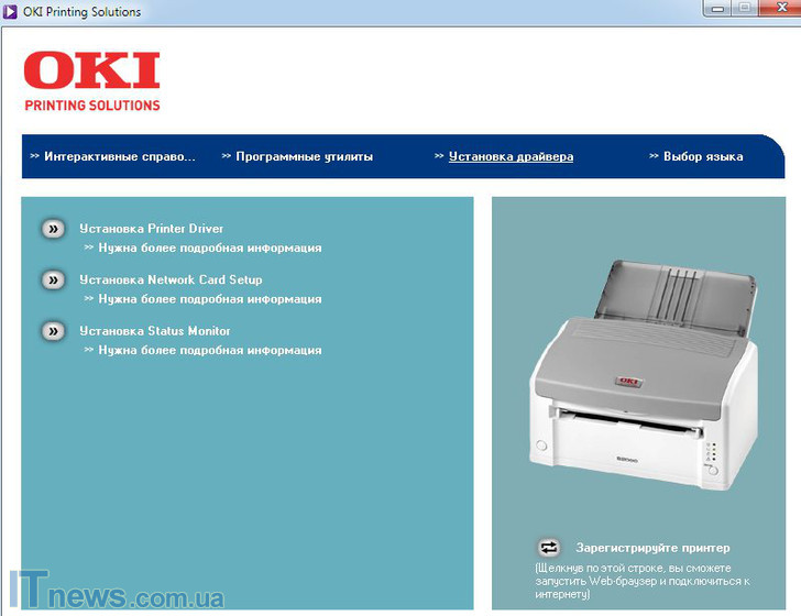 Вначале надо установить необходимые драйвера — с прилагаемого компакт-диска. Все это происходит легко и просто из понятного интерфейса, при чем принтер можно установить как домашний и как сетевой. Установка занимает несколько минут. Там же можно ознакомиться с подробной интерактивной инструкцией и установить программные утилиты.