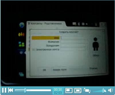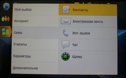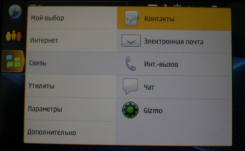 В подменю связь сосредоточены пять приложений: контакты, электронная почта и интернет-вызов. Подпункт "контакты" сосредотачивает в себе электронные адреса абонентов пользователя. Все адреса можно разбить по группам. Основные здесь три подпункта (друзья, коллеги, родственники), а также три рабочие группы: "все", "в сети", "недавние". Впрочем, несмотря на то, что контактная база предусмотрена для записей адресов электронной почты, пользователь, в процессе записи нового контакта может добавить новое поле, среди предустановленного перечня которых есть и номер телефона, и много другого. Ко всему прочему, к новоиспеченному контакту можно также присвоить фотографию.