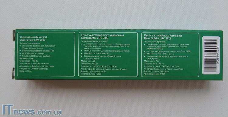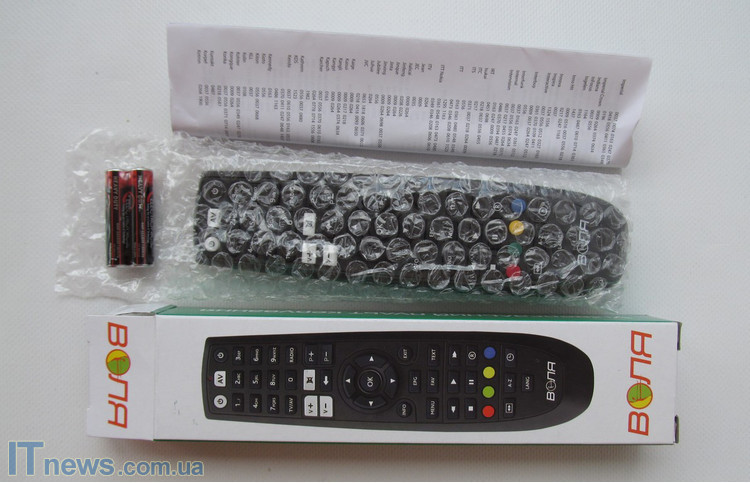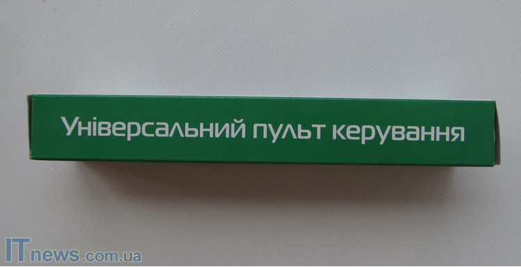 Пульт поставляется в картонной упаковке, на которой указаны его технические характеристики на трех языках: английском, русском и украинском. Помимо самого пульта в комплекте идут инструкция и пальчиковые батарейки.