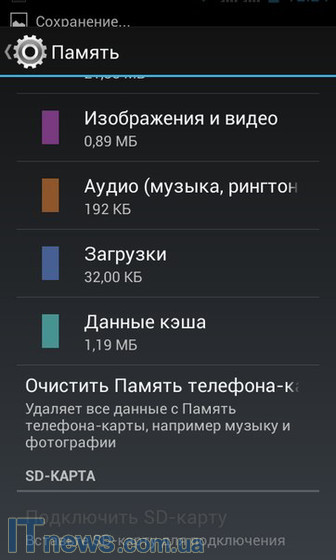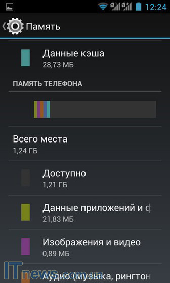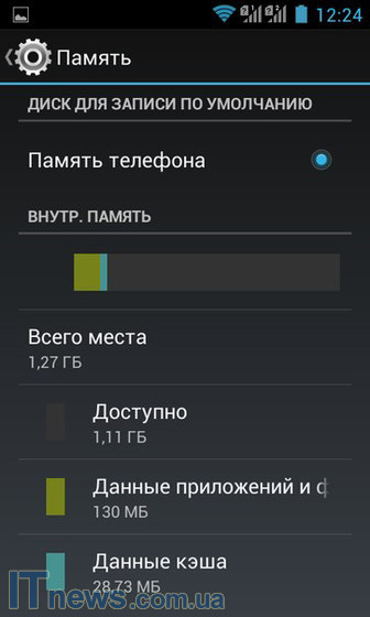 4 ГБ встроенной памяти, из которой работать можно чуть менее чем с тремя: 1,27 ГБ - память на основе встроенного FLASH-носителя, а еще 1,24 ГБ - внутренняя память телефона.