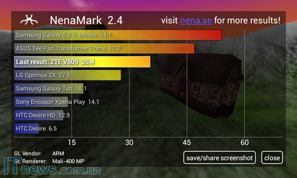 ZTE V809 получил новейшую платформу MediaTek MT6572, в составе которой два вычислительных ядра ARM Cortex-A7 с тактовой частотой 1,3 ГГц. Кроме того, "на борту" графика Mali-400MP и 512 МБ оперативной памяти.
