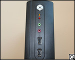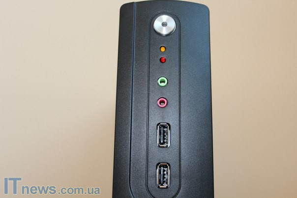 На противоположной стенке обустроены два USB-порта, выводы для подключения наушников и микрофона, а также кнопка включения питания с подсветкой в центре. Кроме того, здесь же расположены два других светодиода, сигнализирующие о тех или иных процессах.