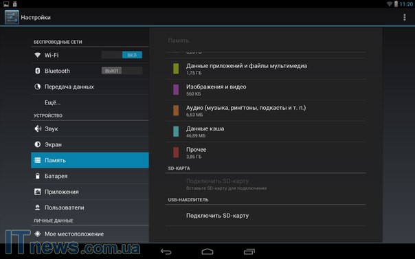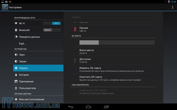 Расширение предусмотрено как за счет специальных карт, так и USB-накопителей. 32 ГБ карту система распознала без проблем, как, впрочем, и USB 2.0 накопитель. А вот USB 3.0 стандарт планшету оказался не по силам.