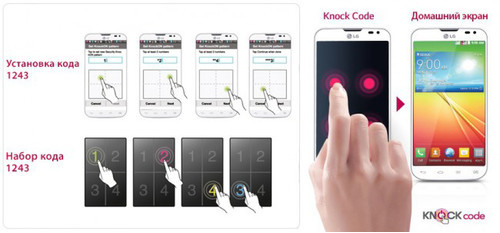 Смартфон обладает функцией Knock Code - усовершенствованной версией KnockOn, позволяющей разблокировать смартфон, дважды постучав по экрану. Теперь еще можно установить надежный пароль, в основе которого - точки прикосновения к экрану. Комбинация вашего уникального пароля может составлять от 2 до 8 прикосновений и быть с легкостью введена в любой части дисплея даже одной рукой.