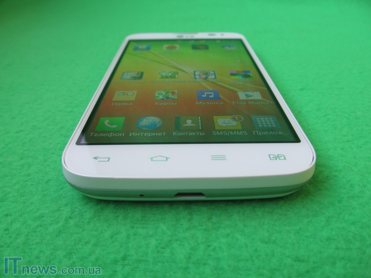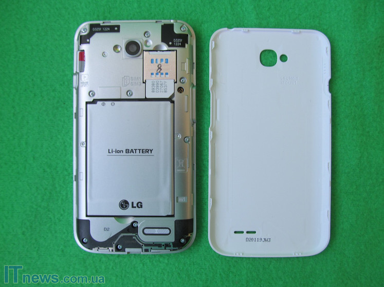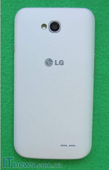 LG L70 имеет добротный пластиковый корпус со скругленными краями, при чем задняя крышка в практичную "мелкую сеточку", так что никаких отпечатков и пятен на ней не останется. По периметру идет серебристый пластиковый ободок "под металл".