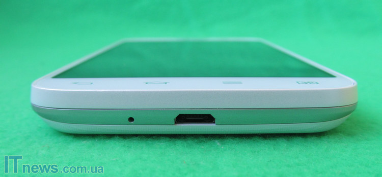 На боковых торцах расположены все необходимые разъемы и кнопки. Это сверху - аудиоразъем и отверстие микрофона, на левом торце - регулятор громкости, снизу - разъем microUSB и еще одно отверстие микрофона, а справа - кнопка питания-блокировки экрана.В верхней части задней крышки выступают глазки основной встроенной камеры на 5 Мп и вспышки, а в нижней - вмонтирована сеточка динамика громкой связи.
