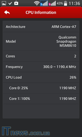 Смартфон оснащен двухъядерным процессором Qualcomm Snapdragon 200 (MSM8210) с частотой 1,2 ГГц и графическим ядром Adreno 302. Оперативная память 1 ГБ, встроенная же - 4 ГБ, из которых доступно всего 1,3 ГБ.