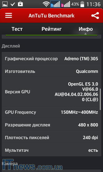 Смартфон снабжен 4,5-дюймовым IPS-экран, хотя его разрешение невысоко - 480х800 точек. В то же время яркость, цветопередача и углы обзора - на весьма пристойном уровне.