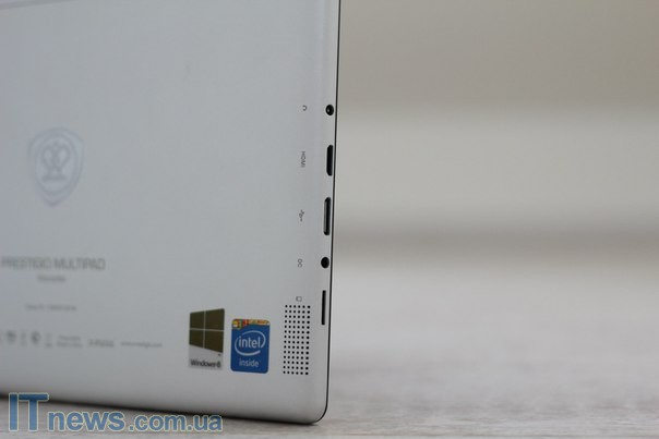 На тыльной панели расположена большая эмблема компании-производителя, а также выводы динамиков громкой связи, наклейки с логотипами компаний-партнеров Prestigio плюс различные подсказки о функциональных элементах на торцах. Помимо этого здесь же обустроена небольшая пластиковая вставка, под которой спрятаны всевозможные антенны беспроводных модулей и интерфейсов, а непосредственно в самой вставке проделан слот для SIM-карт.