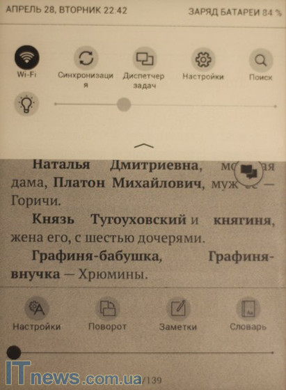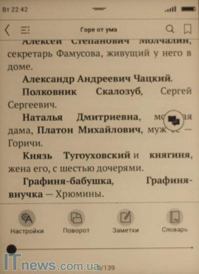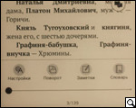 Во время чтения пользователь волен вызвать некого рода техническое подменю. Для этого необходимо всего лишь нажать по центру экрана. В последнем предусмотрен быстрый доступ к настройкам, словарю ABBYY LINGVO UNIVERSAL, к заметкам и мн. др.