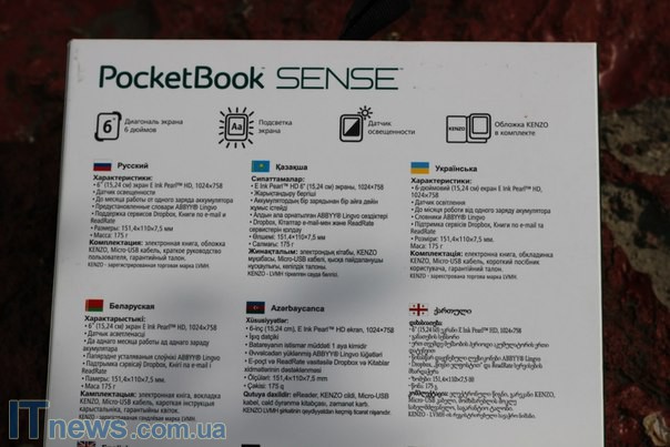 В отличие от оригинальной версии PocketBook Sense, комплектация PocketBook Sense with KENZO cover отличается лишь одним – специальным чехлом KENZO cover. В остальном содержимое коробок аналогичное: само устройство, кабель micro-USB плюс несколько информационных вкладышей: инструкция по креплению обложки, гарантийный талон и краткое руководство пользователя.