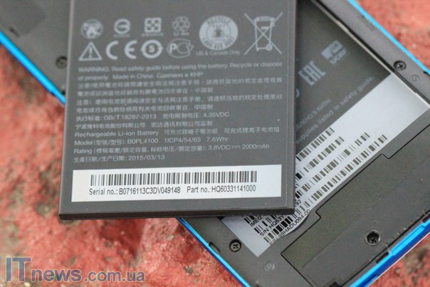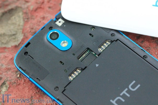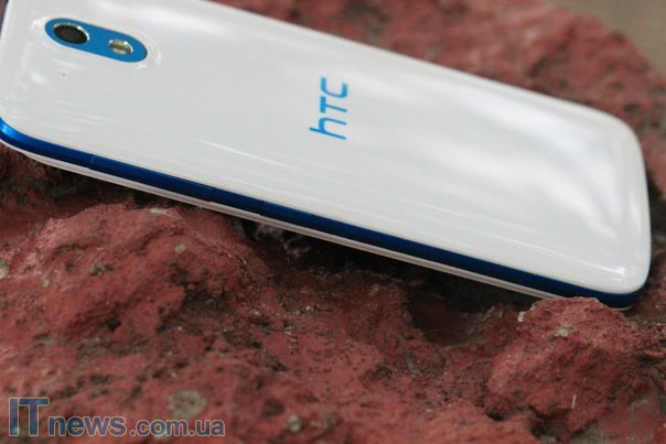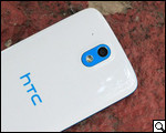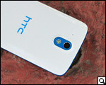 Тыльную панель полностью прикрывает крышка аккумуляторного блока. В нее встроен вывод под глазок основной камеры и вспышки, а чуть в стороне чуть заметно отверстие микрофона шумоподавления. Кроме всего перечисленного на этой же стороне несложно увидеть и логотип HTC, нанесенный посредством специальной краски.