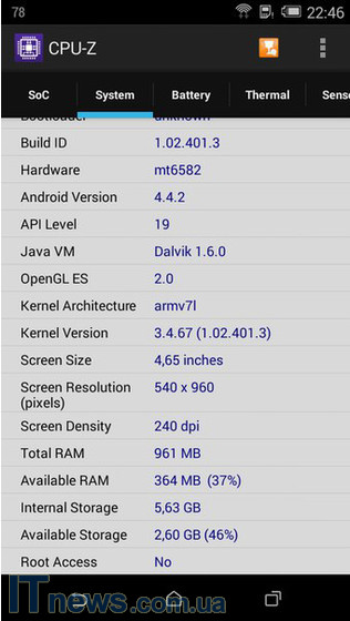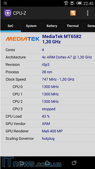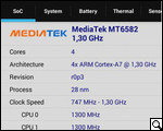 В основе 4-ядерный процессор MediaTek MT6582, тактовая частота которого 1,3 ГГц, с графикой Mali-400 MP и 1 ГБ оперативной памяти.