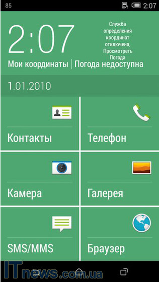 Передняя панель смартфона "разделена" между дисплеем, тремя наэкранными сенсорными кнопками, глазком фронтальной 2 Мп камерой, а также сетками динамиков: сверху – разговорный, снизу – громкой связи. Помимо всего упомянутого, здесь же расположен датчики приближенности и освещения.