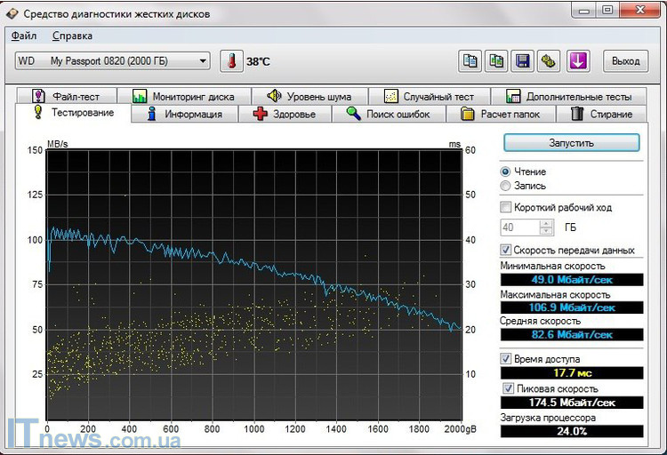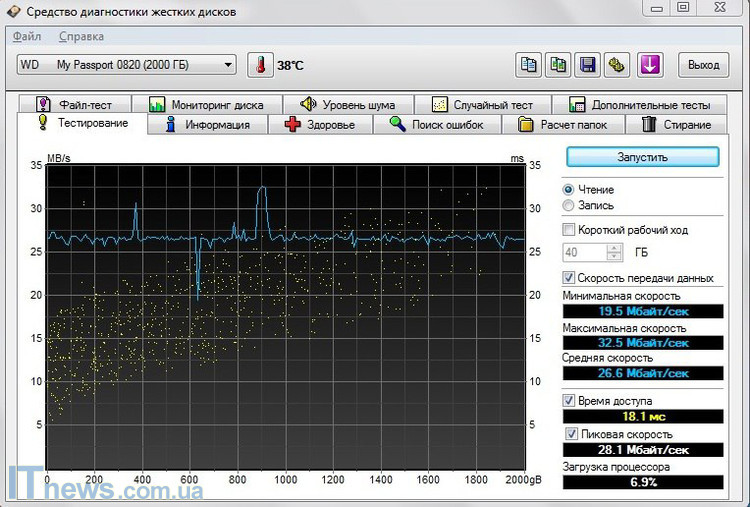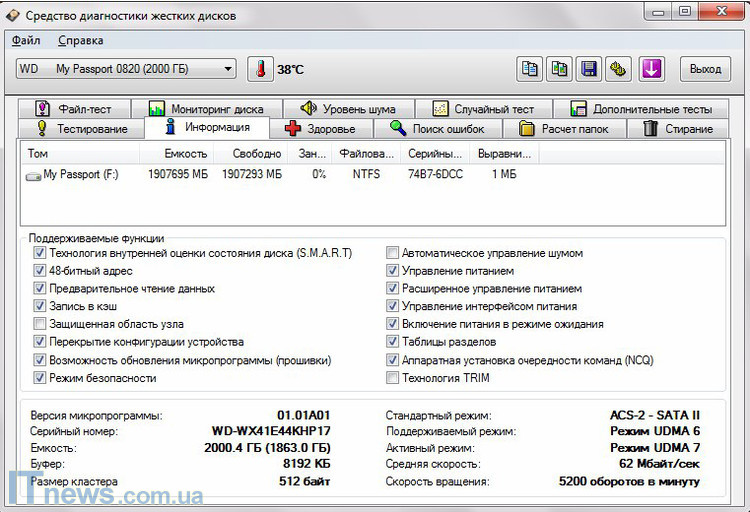 Утилита HD Tune Pro показала, что, рабочая температура WD My Passport Ultra (2ТБ) 38 градусов. Скорость вращения шпинделя диска 5200 об/мин., а количество кэш-памяти 8 МБ. Кроме того, здесь внутренний интерфейс – SATA II.