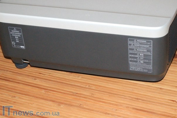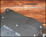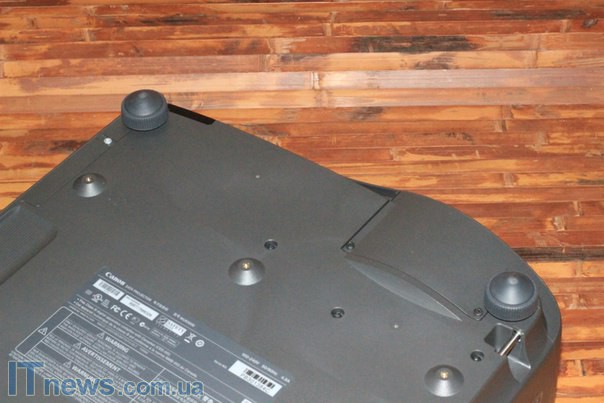 И, наконец, осматривая нижнюю рабочую поверхность, легко заметить две вращающиеся ножки, уготованные для регулировки уровня подъема изображения (максимально - 6 градусов). Кроме них, здесь же расположены насадки с внутренней резьбой (уверен, несложно догадаться, для каких целей), довольно большая наклейка с различными техническими данными и прочие, с позволения сказать, "элементы".